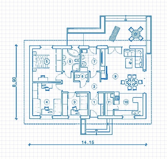 “Locuința familiei Asavinei este casă parter ieftin de construit, ideală pentru o familie de patru persoane. Pe lângă forma simplă, avantajul clădirii este accentuat de funcționalul bine gândit. Vestibulul și holul împart corpul clădirii în două zone. Zona de living include o bucătărie cu cămară și un living cu șemineu. Un cazan mare poate acționa simultan ca o spălătorie și dacă este necesar, în ea poate fi instalată o sobă cu combustibil solid. Există trei dormitoare și o baie în zona de noapte. Un design optim pentru investitorii care apreciază soluțiile arhitecturale simple și dovedite.”